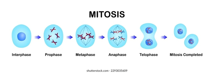 Figure 2: Different Stages of Mitosis cell division  (Credit: https://www.shutterstock.com/search/mitotic-cell-cycle)
