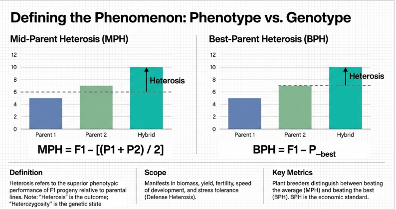 The conceptual evolution of this phenomenon has advanced significantly since Shull first coined “heterosis” in 1914 to replace the technically ambiguous “heterozygotic stimulation.” While often conflated, a professional distinction exists: “hybrid vigor” specifically denotes the phenotypic manifestation of increased biomass or yield, whereas “heterosis” describes the broader genetic superiority of the hybrid, including modern constructs like “defense heterosis.” This later term refers to the enhanced resilience against biotic stresses where the F1 outperforms even the most resistant parent.