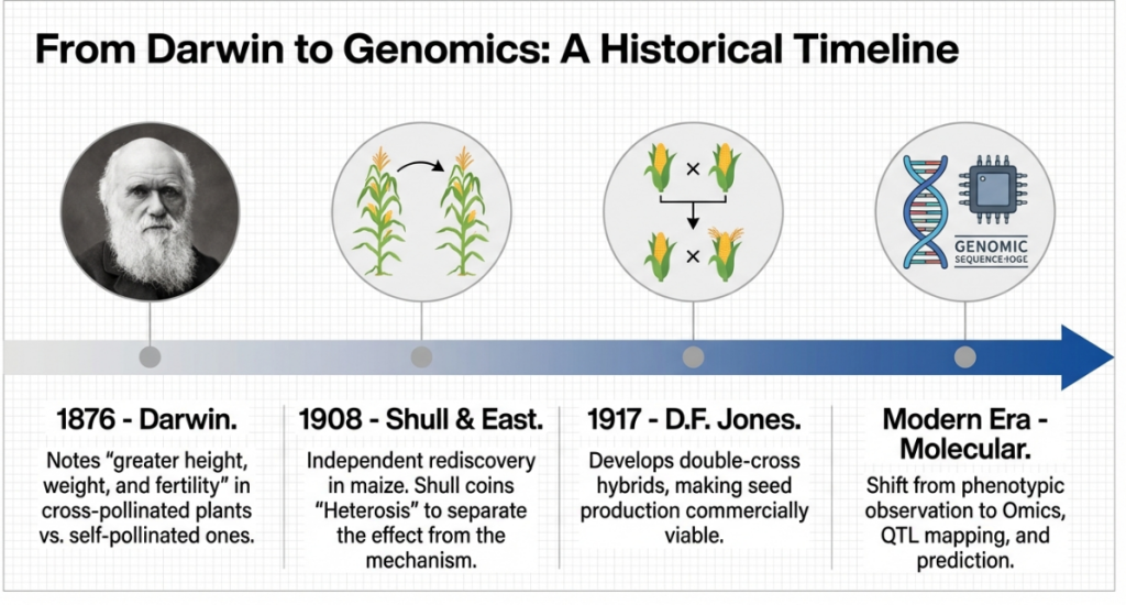 ◦ 1914: George Shull coined the term “Heterosis” to denote the superior performance of F1 hybrids. Critically, Shull broadened the concept to include resistance to biotic stresses and environmental rigors, establishing that hybrid advantage extends far beyond simple biomass.