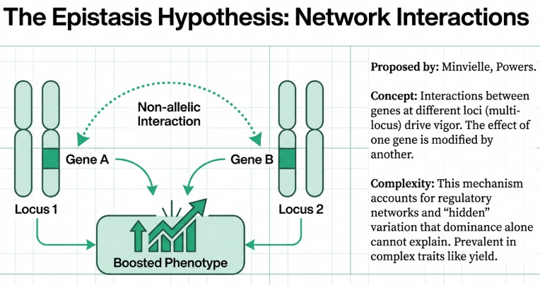 Beyond single-locus effects, the Epistasis Hypothesis emphasizes non-additive interactions between genes at different loci. Modern breeding programs utilize Genome-Wide Association Studies (GWAS) and expression Quantitative Trait Locus (eQTL) mapping to identify these complex, “context-dependent” regulatory relationships. By treating gene expression as a molecular phenotype, breeders can construct epistatic maps that reveal how trans-eQTLs and SNP-SNP interactions reshape transcriptional networks in the hybrid. This perspective suggests that heterosis is not just about allele presence, but about the unique genomic environment created when two divergent regulatory systems are integrated.