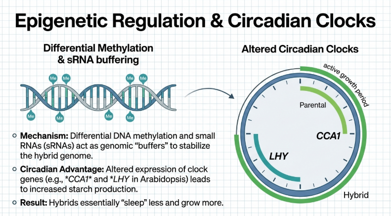 • Molecular Synergy and Timing: Hybrids often show an “above-high-parent” surge in Salicylic Acid (SA), the key immune hormone. But more SA isn’t always better; too much can stunt growth. The “aha!” moment here is timing. The core circadian factor CCA1 ensures that this SA surge happens rhythmically—usually at night or during an infection. This allows the plant to boost its defense without interfering with growth-related genes during the day, effectively solving the “growth-defense trade-off.”