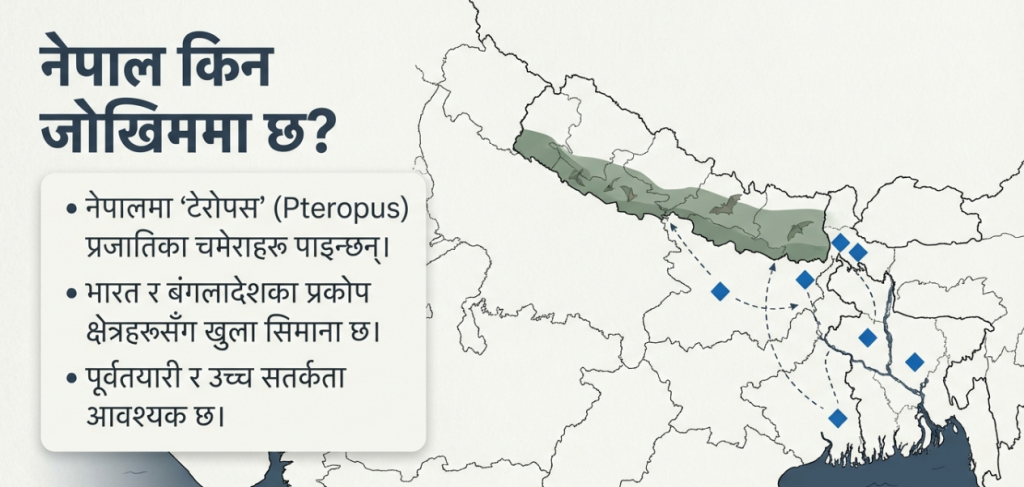 नेपालमा हालसम्म निपाह भाइरसको प्रकोप नदेखिए पनि हामी उच्च जोखिममा छौँ। बंगलादेशको ‘निपा बेल्ट’ (Nipah Belt) मानिने २० जिल्लाहरू र भारतको पश्चिम बंगाल (सिलिगुडी) क्षेत्र नेपालको सिमानासँग जोडिएका छन्। खुला सिमाना र मानिसहरूको अनियन्त्रित आवागमनले गर्दा जुनसुकै बेला भाइरस भित्रिन सक्छ।