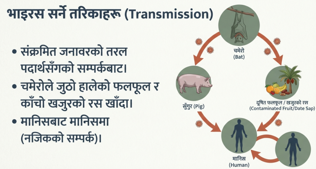 • दक्षिण एसिया (भारत र बंगलादेश): यस क्षेत्रमा संक्रमण प्रायः कुनै मध्यवर्ती जनावर बिना नै सिधै चमेरोबाट मानिसमा सरेको पाइन्छ। विशेष गरी काँचो खजुरको रस (Date palm sap) संकलन गर्ने क्रममा चमेरोको मलमूत्रले रस दूषित हुने र सो रस सेवन गर्दा मानिस संक्रमित हुन्छन्।