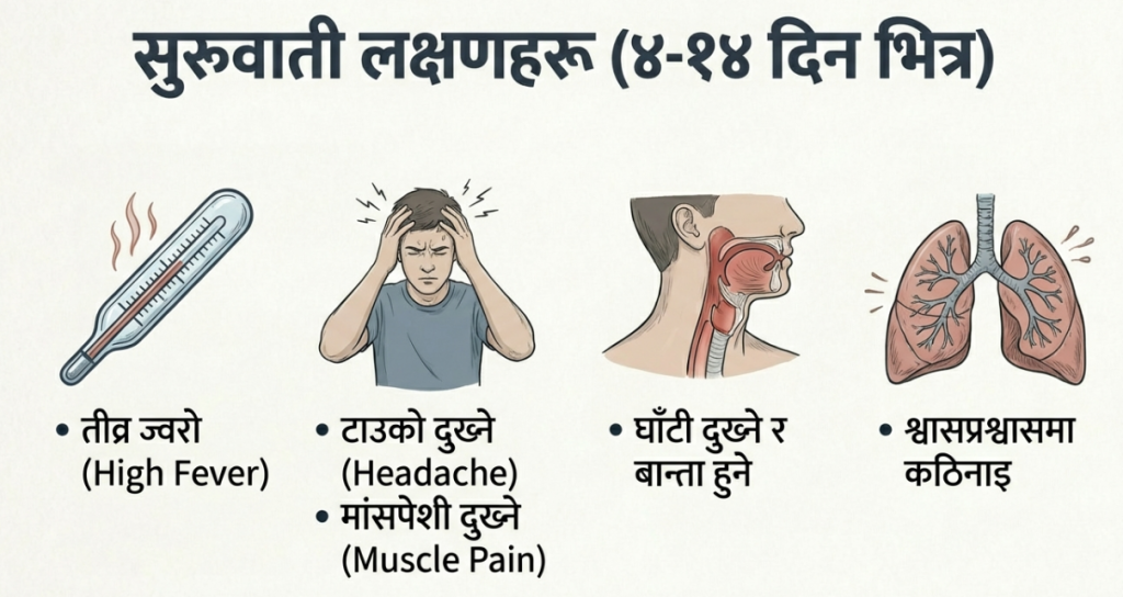 • सुरुवाती अवस्था: उच्च ज्वरो, टाउको दुख्ने, मांसपेशी दुख्ने (Myalgia), बान्ता हुने र घाँटी दुख्ने।