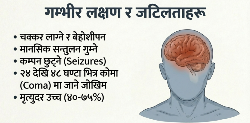 • स्नायु सम्बन्धी गम्भीरता: बिरामीमा चक्कर लाग्ने, अत्यधिक झुम्म हुने (Drowsiness), र मानसिक भ्रमको स्थिति पैदा हुन्छ। यो अवस्था २४ देखि ४८ घण्टाभित्रै ‘इन्सेफलाइटिस’ (Encephalitis – मस्तिष्कको सुजन) मा परिणत भई बिरामी कोमामा जान सक्छ।
