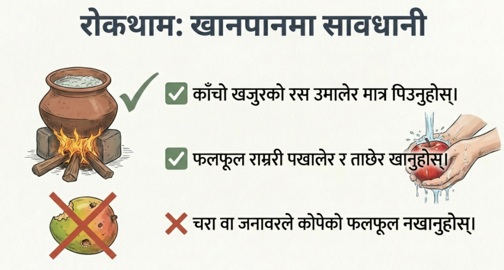 • खजुरको रसमा सावधानी: काँचो खजुरको रस वा ताडी नपिउने। पिउनै परेमा १०० डिग्री सेल्सियसमा कम्तीमा १५ मिनेट उमालेर मात्र पिउने।