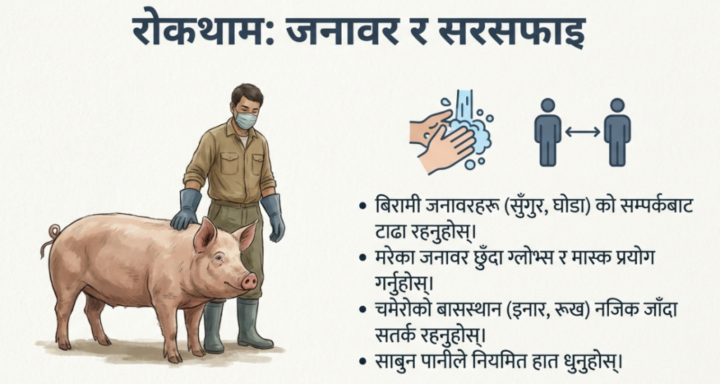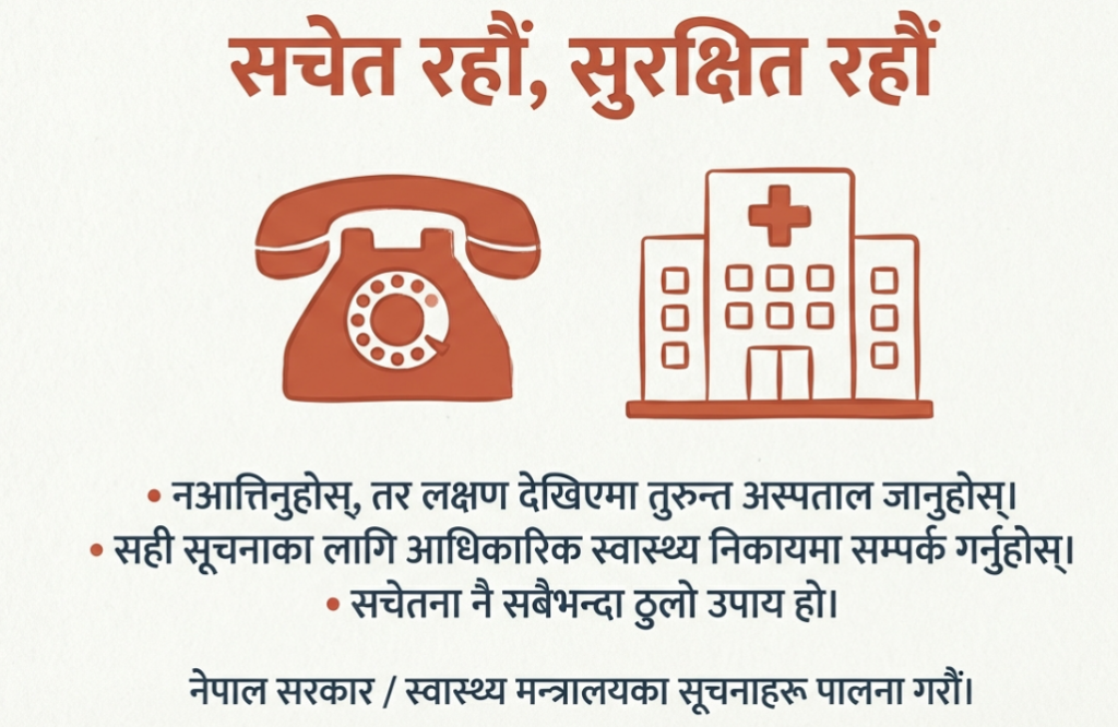 • अस्पतालमा सतर्कता: शंकास्पद बिरामीको हेरचाह गर्दा स्वास्थ्यकर्मीले पूर्ण PPE (N95 मास्क, गाउन, पन्जा र चस्मा) प्रयोग गर्नुपर्छ।