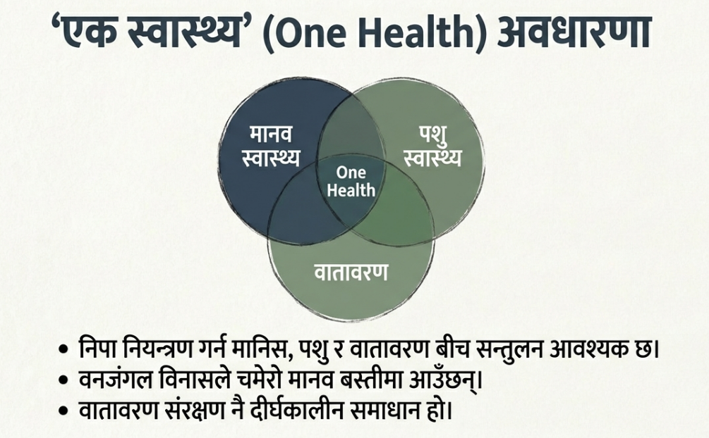 २. एकीकृत स्वास्थ्य अवधारणा (One Health Approach): यो भाइरस जनावर, वातावरण र मानिससँग जोडिएको हुनाले पशु स्वास्थ्य र मानव स्वास्थ्य क्षेत्र बीच बलियो समन्वय आवश्यक छ। चमेरो र सुँगुर पालन क्षेत्रमा नियमित अनुसन्धान गरिनुपर्छ।