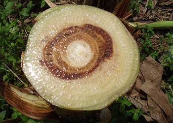 - Pseudo-stem चिरा परेर भित्रबाट खैरो-रातो रंगको दाग देखिन्छ